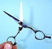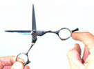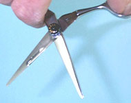 tighter, than too loose. RAPID EDGE SCISSOR TENSIONING INSTRUCTIONS. We use gravity as the means to assess correct tension. Using your left hand, hold the thumb ring between your thumb and index finger and point the tip of that blade upright to true vertical. Then, using the right index finger, raise the other [or free] blade to the + position (left image) and allow the free blade to drop. The amount of drop measures the tension. The blade should drop to between 10 o'clock (center image) to 11 o'clock (right image) imagining a clock face behind it. If the scissor does not drop, it's too tight. If it closes completely, it's too loose. A happy medium is what we are after. Once you find your own ideal tension, stick to it, as the scissor will bed into your hand. ![]() ![]() ![]() |
